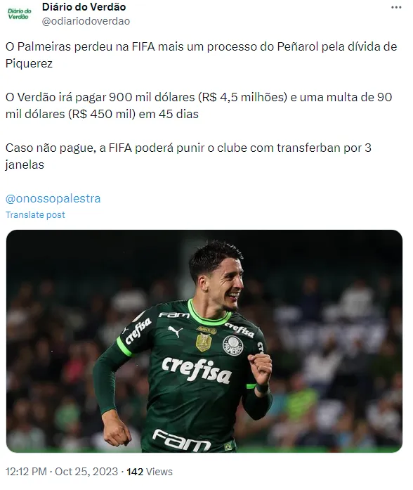 Segundo informações da ESPN, o Palmeiras perdeu uma ação movida pela FIFA, imposta pelo Peñarol, do Uruguai, devido ao atraso no pagamento de uma parcela da compra do jogador Piquerez, em junho de 2021. A transferência do uruguaio girou em torno de R$19,7 milhões na época. Em setembro, desse ano, foi revelado que o clube enfrentava atrasos devido a problemas de “fluxo de caixa”.