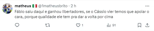 Porém, o Cruzeiro parece não ser o único time na jogada. Isso porque, de acordo com o jornalista Samir Carvalho, Cássio também tem proposta oficial para jogar em outro time.