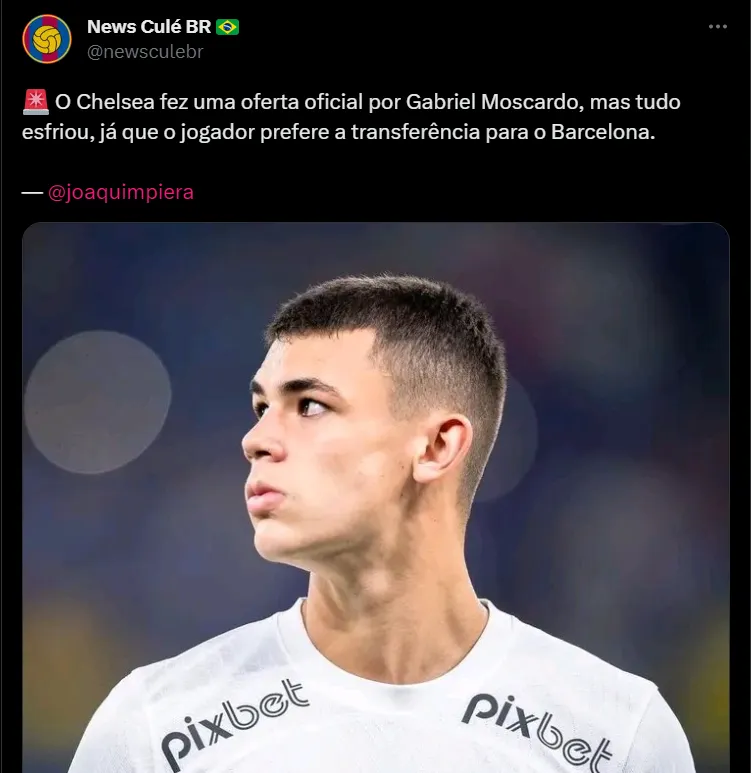 De acordo com as informações publicadas pelo jornalista Joaquim Piera, Gabriel Moscardo quer jogar no Barcelona, na Espanha, apesar do interesse do Chelsea, da Inglaterra.
