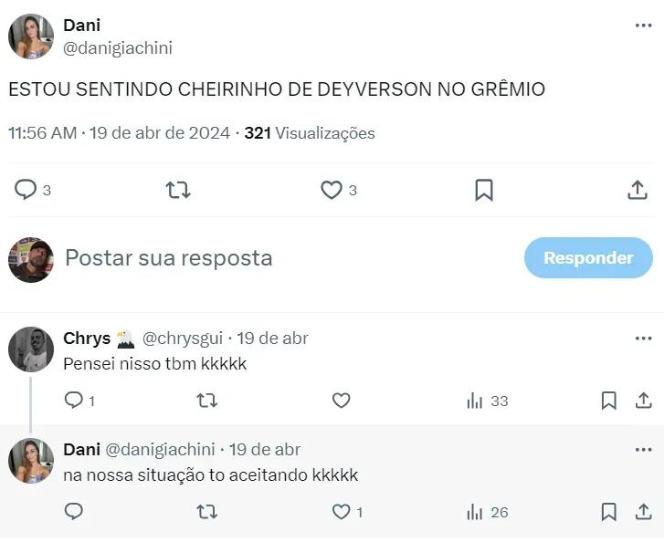 Nas redes sociais, em meio ao interesse antigo gremista no jogador, torcedores do clube desconfiam que o novo destino de Deyverson seja o Grêmio. “Alguma dúvida que ele vai jogar pelas três cores?” disse um torcedor.