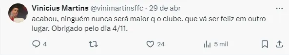 Com isso, acabou sendo afastado do elenco principal e segue sem jogar pelo Flu. A última partida foi no dia 20 de abril, quando atuou por quatro minutos na vitória por 2 a 1 sobre o Vasco.