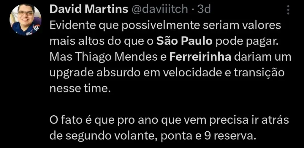 Além disso, Ferreirinha não está disposto a reduzir seus vencimentos para atuar em outro clube e quer manter um salário semelhante ao atual, algo em torno de R$ 700 mil segundo o Portal dos Times.