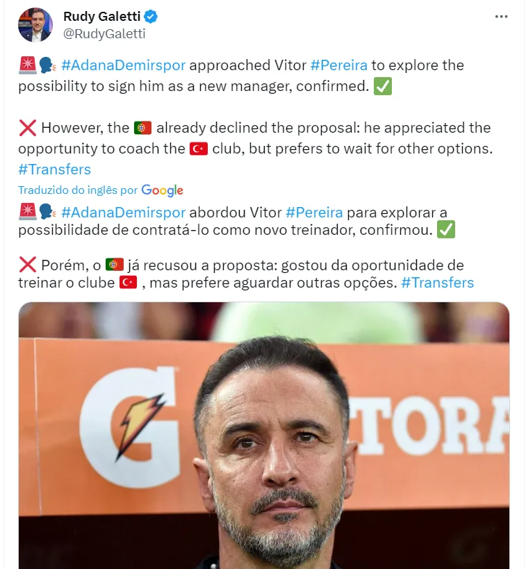 De acordo com informações de Rudy Galetti, Vitor Pereira gostou do projeto do Adana Demirspor, mas preferiu recusar, pois aguarda, no mercado, outras opções para voltar a trabalhar.