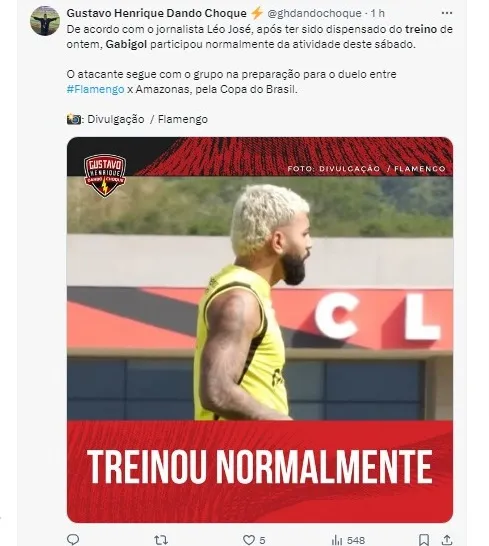 Após uma sessão de exercícios na academia ao lado dos companheiros, ele seguiu para o campo, dando continuidade à preparação do Flamengo para o confronto contra o Amazonas, que acontecerá na próxima quarta-feira (22), em Manaus, às 21h30 (horário de Brasília).