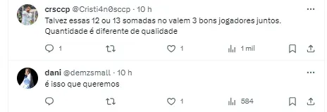 “Queremos montar um elenco. O Corinthians não tem um elenco, tem um time. Quando você faz substituições, mostramos certas dificuldades. Queremos encorpar o elenco, temos vários torneios ao longo do ano, é um futebol competitivo. É para compor o elenco no geral, mas também com peças titulares, isso que necessitamos”