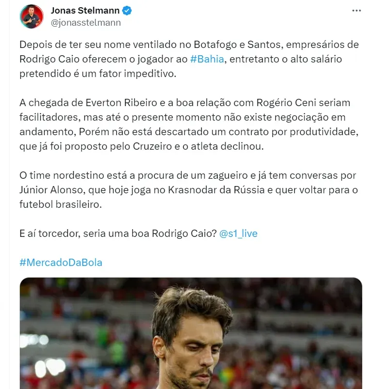 De acordo com Jonas Stelmann, Rodrigo Caio foi oferecido ao Bahia do técnico Rogério Ceni nas últimas horas. O Tricolor está à caça de um novo defensor, e não descarta investir em um possível negócio envolvendo o ex-Flamengo.
