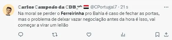 Isso porque, de acordo com David Silva, informação dada em conjunto com Alex Bispo e Renata Villas Boas, o Verdão também é um dos interessados em Ferreirinha.