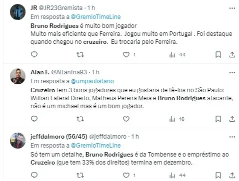 Em seu canal no YouTube, Jorge Nicola compartilhou que dois clubes da Série A estão monitorando Bruno Rodrigues, mas não revelou os times. O jogador do Cruzeiro está sob contrato com o Tombense e o Santa Cruz de Natal e permanecerá emprestado ao Cruzeiro até 31 de dezembro de 2023.
