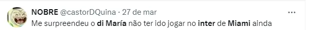 Isso porque, de acordo com o portal El Crack Deportivo, da Argentina, o destino de Di María pode acabar sendo o Inter Miami, clube de Lionel Messi e Luis Suárez na MLS.