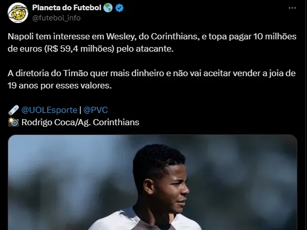 “A diretoria do Timão quer mais dinheiro e não vai aceitar vender a joia de 19 anos por esses valores”, destaca o jornalista Paulo Vinícius Coelho, o PVC, através do UOL Esporte.