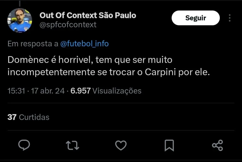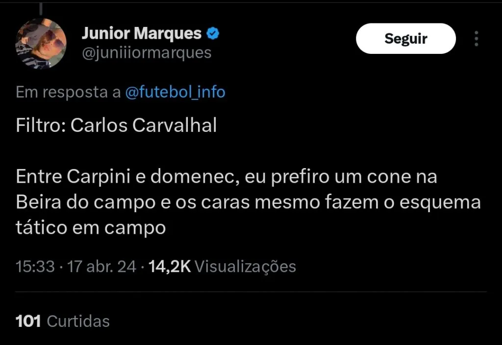 A situação de Carpini está insustentável e ele pode perder o cargo já nesta quarta-feira (18) caso seja derrotado pelo Flamengo. Ele assumiu a equipe no início da temporada após a saída de Dorival, e após um início meteórico, teve uma queda brusca de desempenho.