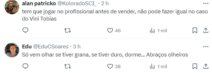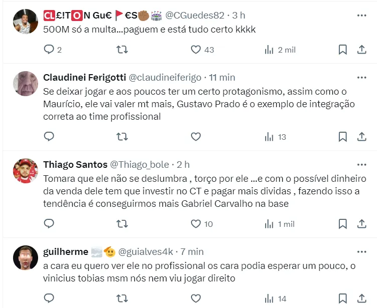 A fonte cita que, além do Manchester City, Arsenal e Benfica estão de olho no jovem. Inclusive, o Arsenal enviou olheiros ao Brasil para acompanhar o jovem jogador, que tem uma multa avaliada em R$ 322 mi.