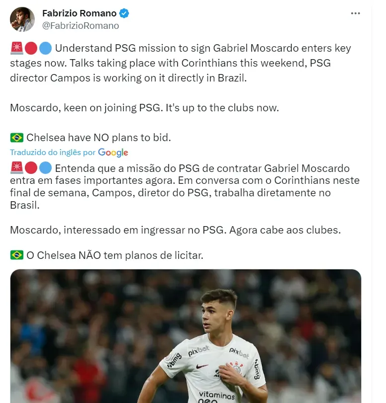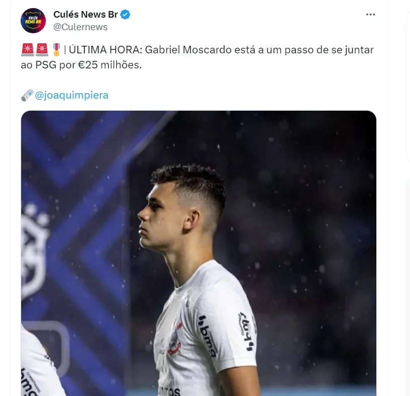 Com receio da forte concorrência no mercado europeu, especialmente de clubes com grande poder financeiro, o PSG está prestes a fechar a compra do jovem Gabriel Moscardo, de apenas 18 anos de idade, uma grande promessa do Corinthians. Para concretizar a transferência, representantes do clube francês da Ligue 1 em breve estarão no Brasil.