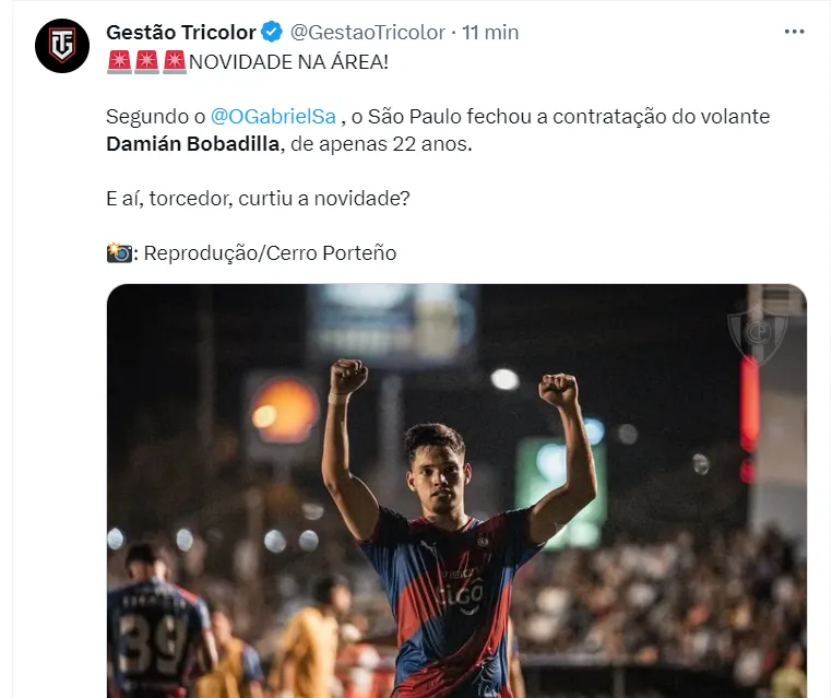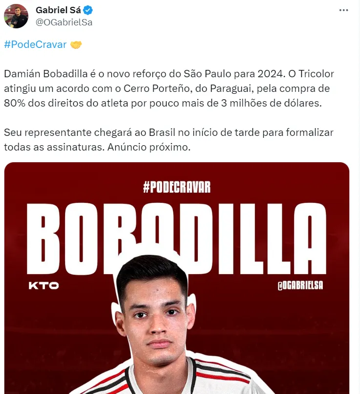 Damián Bobadilla é o mais novo reforço do São Paulo de Dorival para 2024. Negócio fechado. Resta apenas a assinatura do contrato para o anuncio acontecer, como frisa o jornalista. Serão desembolsados cerca de 3 milhões de euros por cerca de 80% dos direitos de Damián Bobadilla.