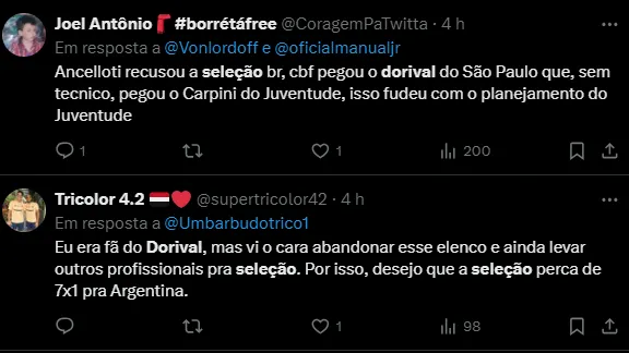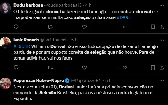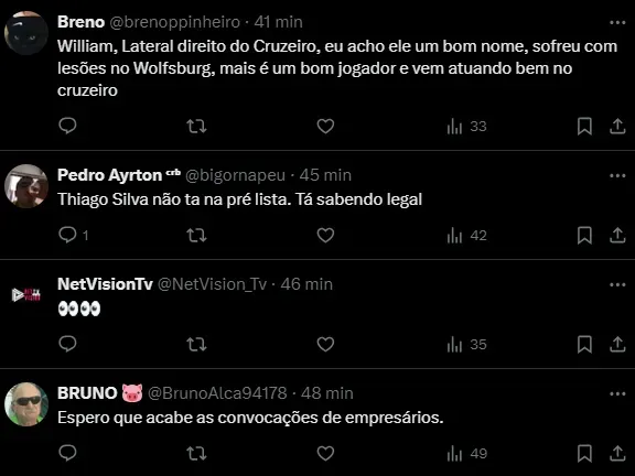 “Na CBF, o trabalho é muito mais de observações, organização, um direcionamento. Temos uma relação com 50, 55 nomes de possíveis convocados, todos esses jogadores estão sendo observados”, acrescentou.