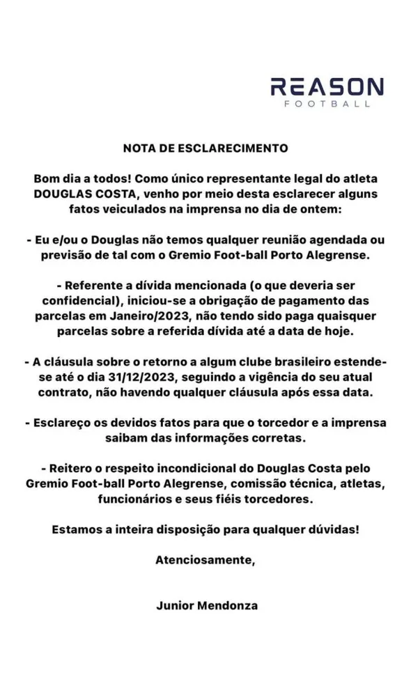 Após a grande repercussão do assunto, o representante de Douglas Costa publicou uma nota oficial afirmando que o jogador não tem nenhuma reunião marcada com o Tricolor. Confira abaixo: