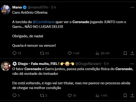 Ao contrário do que vem acontecendo, torcedores desejam que o técnico António Oliveira dê mais oportunidades para Igor Coronado e Garro atuarem juntos.