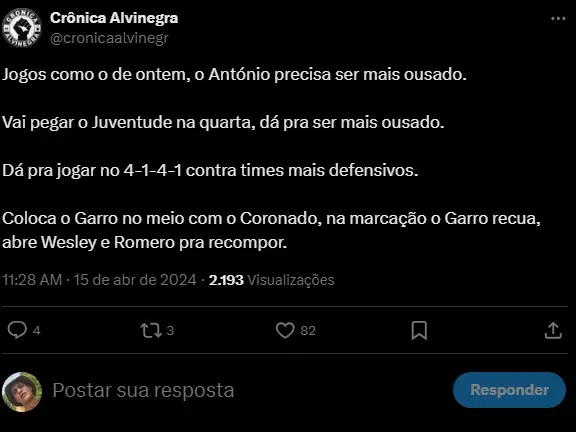 Até uma jogada que começou com Igor e chegou em Rodrigo é relembrada nas redes sociais, além de pedirem para que Toni seja mais “ousado” com as peças que tem no elenco.