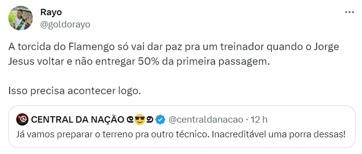 “O Jorge Jesus vai voltar com o candidato de oposição, e vai levar esse candidato à vitória nas eleições do final de ano”, completa sobre o técnico do Al Hilal, que tem contrato com os sauditas até o meio deste ano.