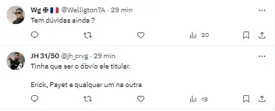 “O time é ele, Pec e Payet na frente. Zé Gabriel, Praxedes e Paulinho fazendo a trinca que deu certo no meio.” , “Ele é craque” , “Tinha que ser o óbvio ele de titular. Erick, Payet e qualquer um na outra ponta”, publicaram alguns torcedores no Twitter.