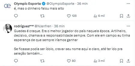 “Guedes estava a um passo de ir para Seleção Brasileira. Só que eu vou falar não para um menino que um ano atrás Vitor Pereira não colocava para jogar, torcida pegando no pé, aí ele deixa passar a proposta do Catar, e chega um Vitor Pereira de novo e tira ele do time? Tem a segurança que vai ficar cinco anos no Corinthians? Então não dá para chamar o cara de mercenário, sendo que se o cara para de fazer gol, vocês querem que ele vá embora no dia seguinte”, começou.