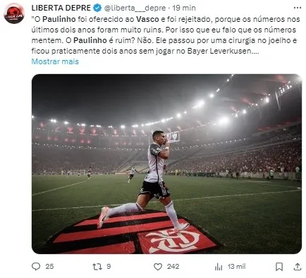 “Quero falar do Paulinho. O Paulinho foi oferecido ao Vasco e rejeitado. Os números do Paulinho nos últimos dois anos eram muito ruins. Por isso eu falo que os números mentem. Paulinho é ruim? Não. Ele passou por uma cirurgia no joelho, ficou dois anos sem jogar direito no Bayer Leverkusen”, explicou Edmundo.