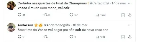 “Se esse comportamento se repetir no Brasileiro, o Vasco vai ter uma temporada tranquila porque tem times melhores que o Vasco do que piores. Mas, se acontecer dos melhores ganharem do Vasco”, iniciou.