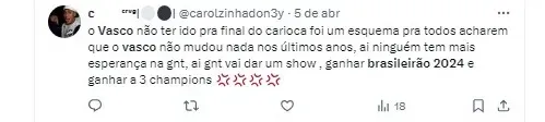 “Tem quatro times menores que o Vasco em termos de orçamento e torcida… estou falando nacionalmente porque eu não diminuo ninguém. O Vitória é gigante no seu estado, o Juventude é grande no seu estado, o Criciúma também, e o Atlético-GO nem se fala”, iniciou.
