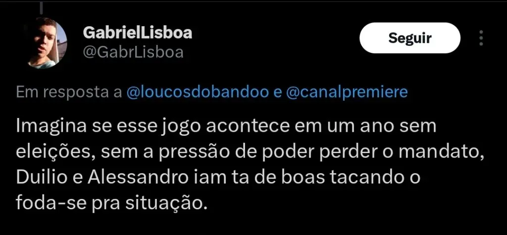 “Difícil falar. O presidente do Corinthians chutou a porta do árbitro na frente do vestiário do Grêmio. Mas o que eu vou fazer, sou treinador do Grêmio. O que eu acho engraçado é que ninguém chutou a porta do VAR lá em São Paulo quando não deram pênalti legítimo para a gente. Ninguém chutou a porta do árbitro né? Estavam satisfeitos. Mas aí é que eu falo: se o treinador chega aqui e fala tudo que tem vontade, fica difícil. Deu, né? Vamos deixar o resto para amanhã.”, disse Renato.