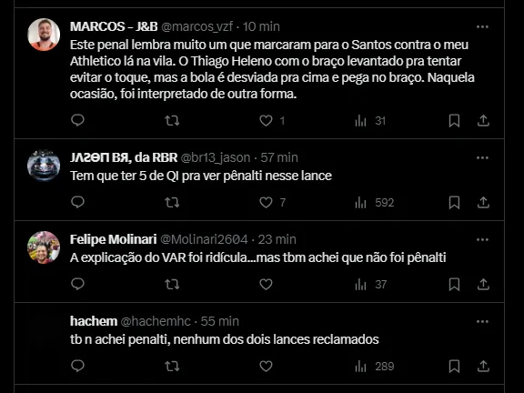 “Para mim foi pênalti do Moscardo. Ele até tentou evitar, mas a bola bateu no cotovelo, que estava ampliando o espaço do corpo, uma posição antinatural. Esse lance lembra o pênalti cometido pelo Rossi contra o Cruzeiro”, destaca.