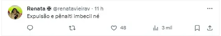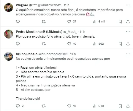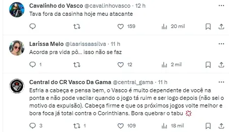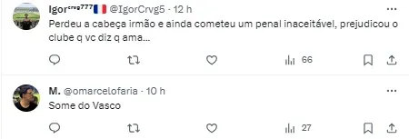 “Não é só a expulsão, o lance do pênalti foi muito juvenil, no último minuto do 1º tempo. Já ajudou mto o Vasco na temporada, mas hoje vai ficar marcado negativamente” , “Acorda pra vida po, isso não se faz” , “Expulsão e pênalti imbecil, né” , “Tinha que pedir desculpa pela atuação horrorosa em campo” , “Parabéns, só fez m* no jogo”