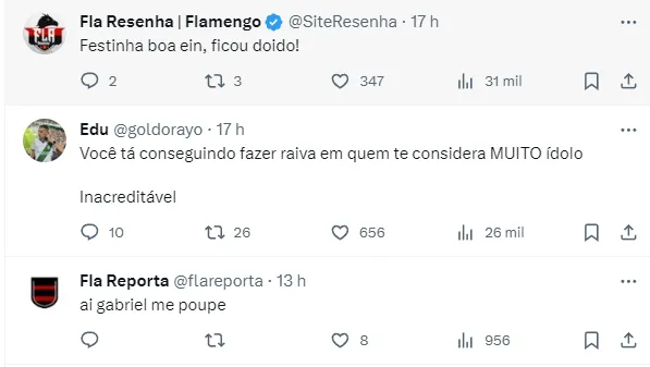 “Eu acho que o Tite não abre mão dele para a próxima temporada. Por tudo que aconteceu, muitos pensam o contrário. Eu conhecendo o Tite tenho quase certeza, convicção que o Tite não abre mão do Gabriel em 2024.”