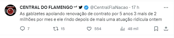 “Ele é um jogador muito decisivo, ele perto da área tem uma característica que o Tite gosta que é o ‘abriu chuta’. Ele vai voltar a fazer gols e trazer alegrias ao torcedor do Flamengo”