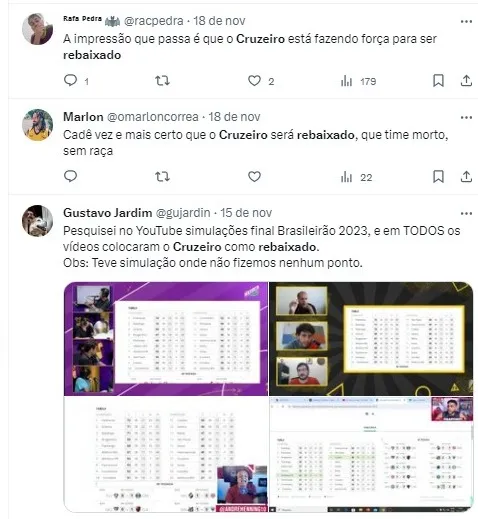 “Cruzeiro permanece na Série A depois dessa vitória. Agora acho que as chances de cair praticamente zera. Quer dizer, não zera, mas não cai mais. Acho que não cai mais, ganha moral. Tem um jogo a menos também”, opinou Sheik.