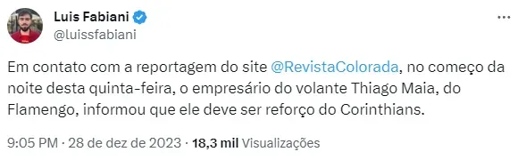 Isso porque, conforme revelado pelo empresário de Thiago Maia à Revista Colorada, o meio-campista, alvo do Colorado, deve mesmo reforçar o Corinthians.