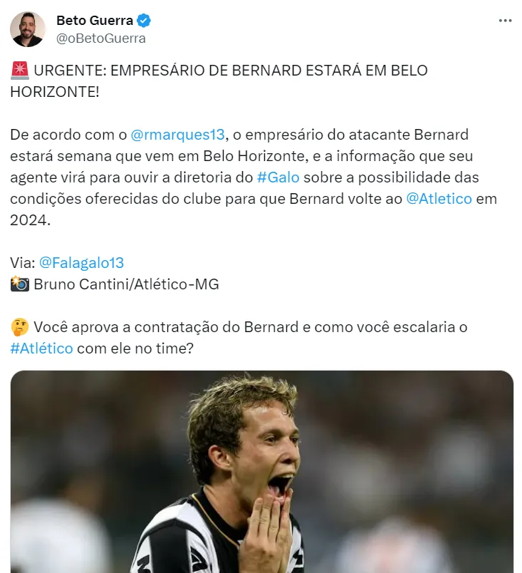 De acordo com o portal Fala Galo 13, o empresário que cuida da carreira do atacante Bernard estará presente semana que vem em Belo Horizonte para ouvir a oferta que o gigante mineiro tem a oferecer por seu atleta.