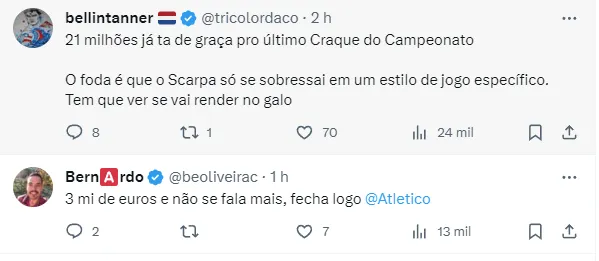 Conforme repercutido pela fonte, o Mais Querido deve fazer uma proposta de empréstimo seguido de obrigação de compra caso Scarpa atinga a um determinado número de jogos.