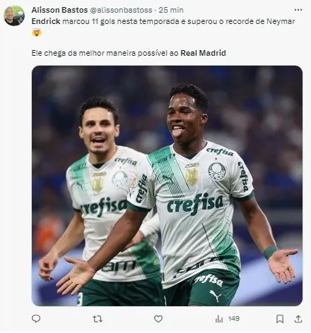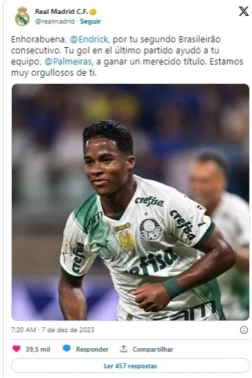 Após o empate, o Real Madrid foi as redes sociais para parabenizar o craque palmeirense e expressar seu orgulho em poder contar com Endrick no elenco futuramente.