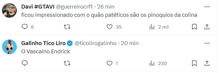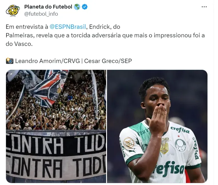Endrick não ficou em cima do mundo e revelou que a torcida do Vasco, de Ramón Diaz, é a que mais lhe deixou impressionado no futebol brasileiro. Essa não foi a primeira vez que o jogador fez elogios ao torcida do Vasco.