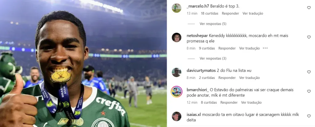 Por fim, fechando a lista, aparece outro atleta do Palmeiras, Luis Guilherme, seguido por Alexsander, campeão da Libertadores de 2023 com as cores do Fluminense.