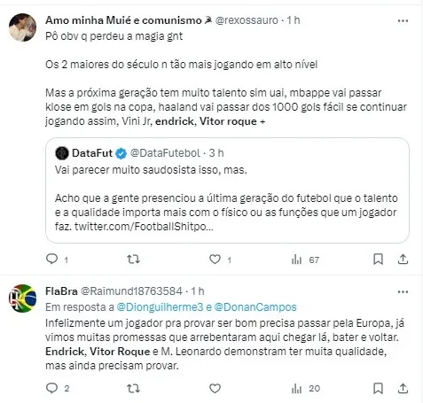 “Endrick muitas vezes não joga no Palmeiras porque lhe falta essa bagagem tática para entender melhor o jogo. Vitor Roque, por sua vez, está mais preparado. Jogava com mais frequência e hoje está mais pronto que o Endrick. Mas ambos, claro, precisam de tempo e carinho para que coloquem seu talento para funcionar”, completou.