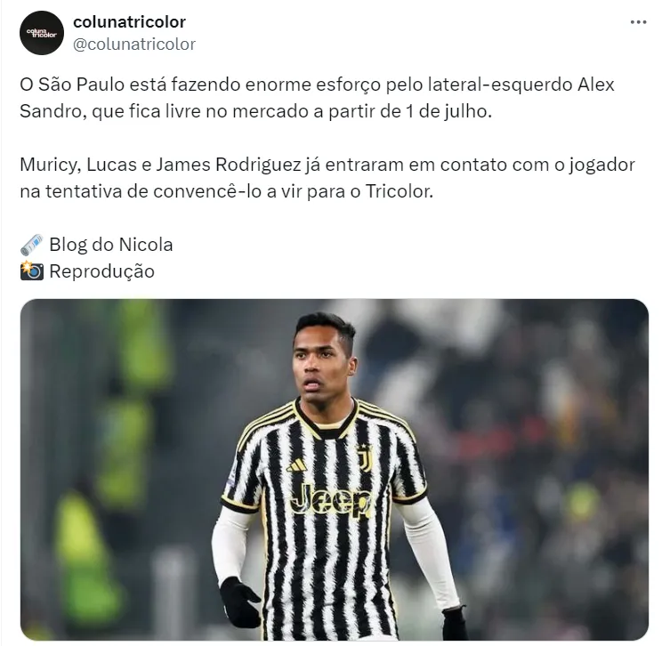 O São Paulo está fazendo um enorme esforço pela contratação do brasileiro Alex Sandro, de 33 anos da idade, ídolo da Juventus, da Itália. O Tricolor deseja ter a contratação do lateral visando a janela de julho do futebol brasileiro.