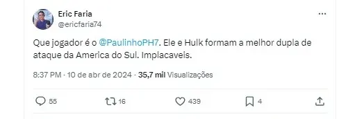 “Que jogador é o Paulinho. Ele e Hulk formam a melhor dupla de ataque da América do Sul. Implacáveis.”, escreveu Eric Faria, na plataforma X.
