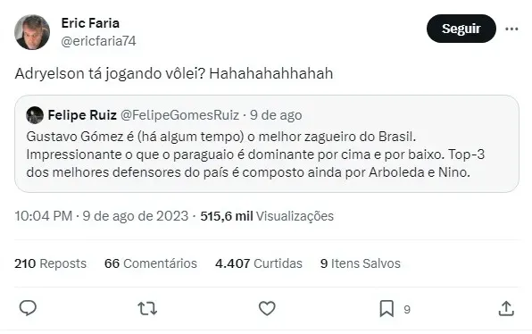Eric Faria, optou por deixar de lado alguns nomes de peso, como Gustavo Gomez, Léo Pereira, Nino e outros, para apontar Adryelson como o melhor zagueiro brasileiro do momento. A surpresa maior residia no fato de que Adryelson já tem seu futuro encaminhado para o futebol europeu em 2024, quando se juntará ao Lyon, um dos principais clubes da França.
