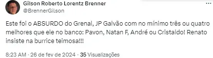 “Este foi o ABSURDO do Grenal, JP Galvão com no mínimo três ou quatro melhores que ele no banco: Pavon, Natan F, André ou Cristaldo! Renato insiste na burrice teimosa!!!”