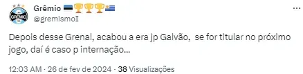 “Depois desse Grenal, acabou a era JP Galvão, se for titular no próximo jogo, daí é caso para internação…”