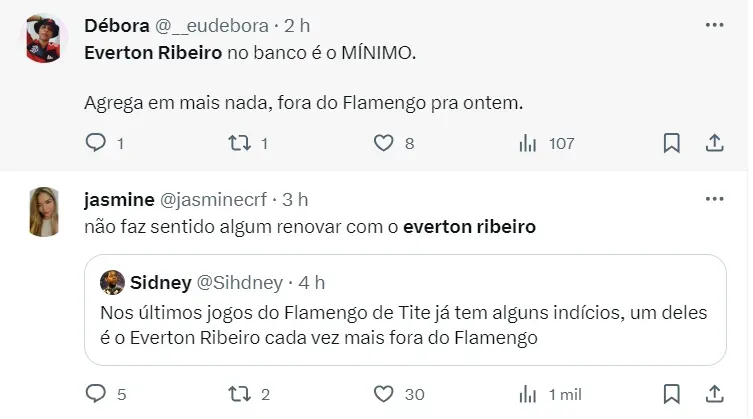 Após o sucesso na contratação de Vidal, o Athletico-PR, agora acompanha outro flamenguista: o veterano Everton Ribeiro, de 34 anos, que está em fim de contrato com o Mais Querido e foi parceiro de Vidal em outros tempos. O jogador faz parte de uma lista de quatro atletas que podem reforçar o time em 2024.