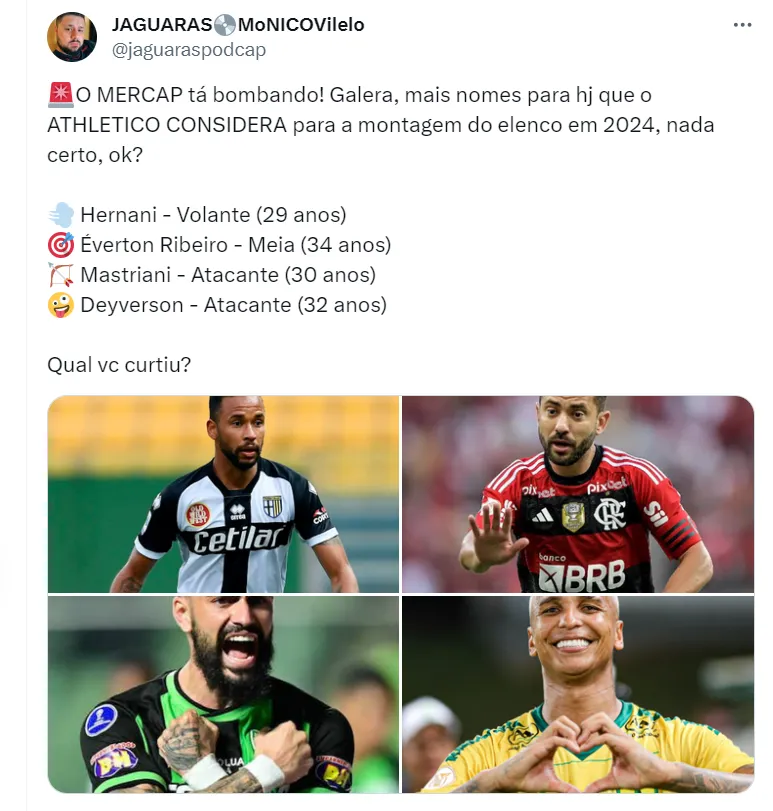 Com foco em Everton Ribeiro, o CAP também olha para outros nomes no mercado, como Deyverson, do Cuiabá, Mastriani, do América-MG, e um velho conhecido da torcida, que você pode conferir clicando aqui.