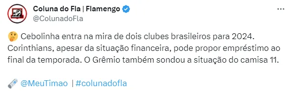 Conforme repercutido pelo portal Meu Timão, ainda no mês de setembro, Grêmio e Corinthians estão de olho na situação de Everton Cebolinha para 2024. Enquanto o clube gaúcho teria sondado a situação do ponta, o Timão pode propor um empréstimo, visto que Cebolinha tem contrato com o Flamengo até dezembro de 2026.
