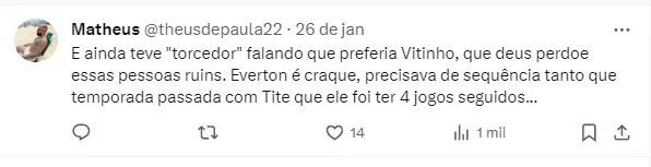 Em 2023, foram 64 jogos disputados, com seis gols marcados e outras 10 assistências fornecidas. Agora, nos primeiros jogos de pré-temporada, Everton novamente aparece entre os escolhidos de Tite.
